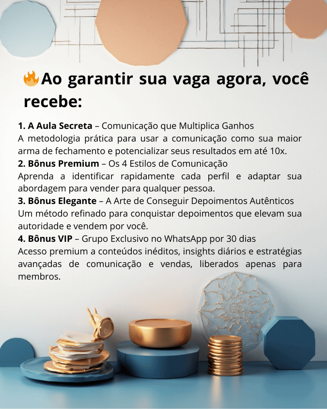 ✔️ Resposta: Aqui você aprende comunicação aplicada ao fechamento — não teoria. É o método que treinei em mais de 500 equipes e que gera resultados reais, rápidos e mensuráveis.